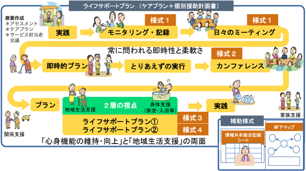 当初、小規模多機能型居宅介護のケアマネジメントについては、平成18年2月のQ&Aにおいて「小規模多機能型居宅介護ならではのサービス利用表の記載例等については追ってお示しする」と示されており、居宅サービス計画書の標準例を利用する場合がほとんどでしたが、本会において平成21年度より「ライフサポートワーク」を提唱し、周知に努めてまいりました。